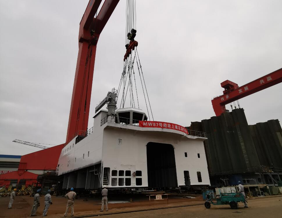 1010日上午,福建馬尾船廠,萬米載人潛水器支持保障母船MW87號(暫定名)順利完成上建總段吊裝,這標志著該船主體結構建造完成、科考設備及其科學與工程實驗室等改造布局已確定,是船舶建造改造的關鍵節點之一。