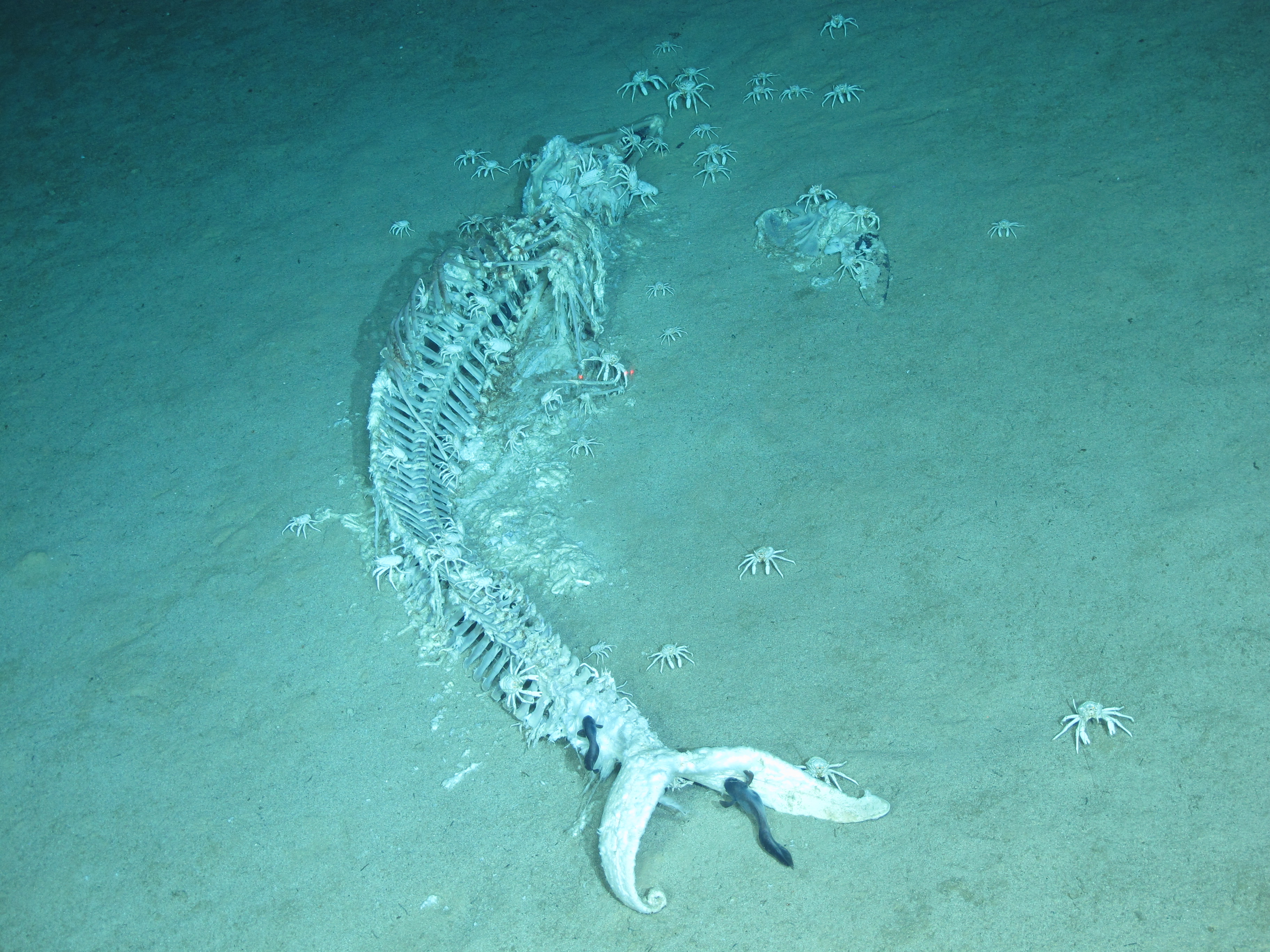 TS16航次共同首席科學家,中山大學謝偉副教授介紹說,此次發現的鯨落,附近有數十只白色鎧甲蝦、紅蝦、以及數只鼬鳚魚,尾部甚至可以觀察到有鼬鳚魚在撕扯肌肉,表明它尚處在第一個階段,推測很有可能是一只死亡不久的鯨,具有長期觀測的價值。