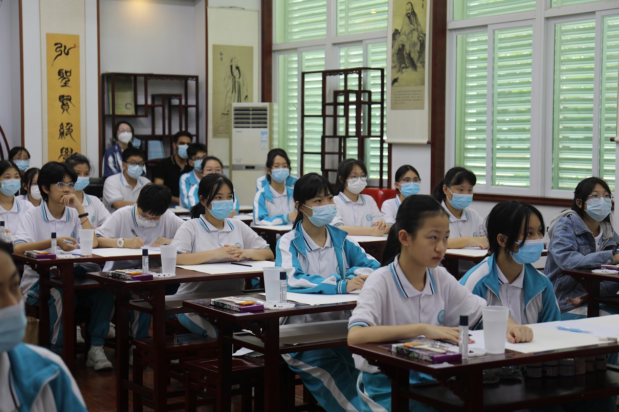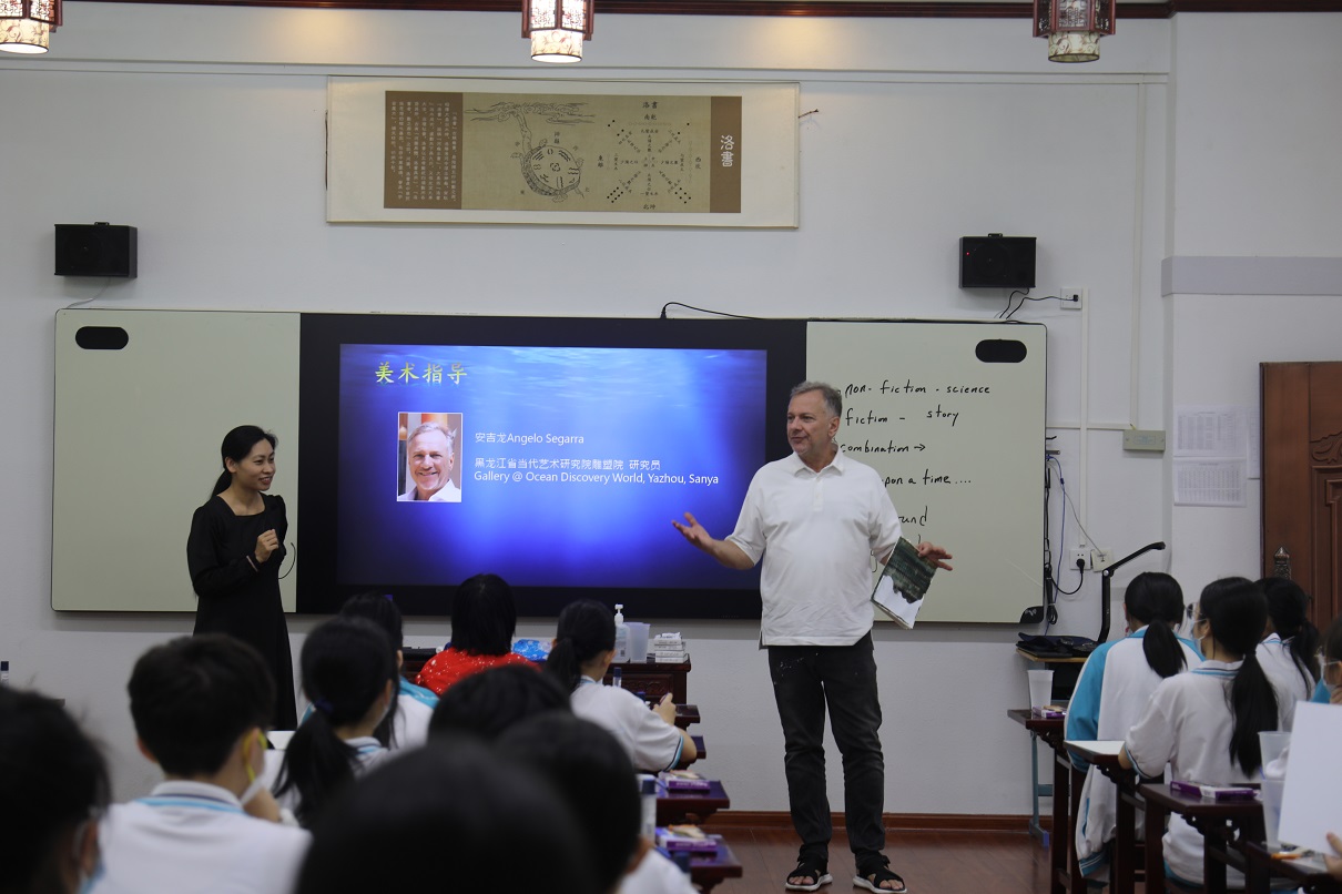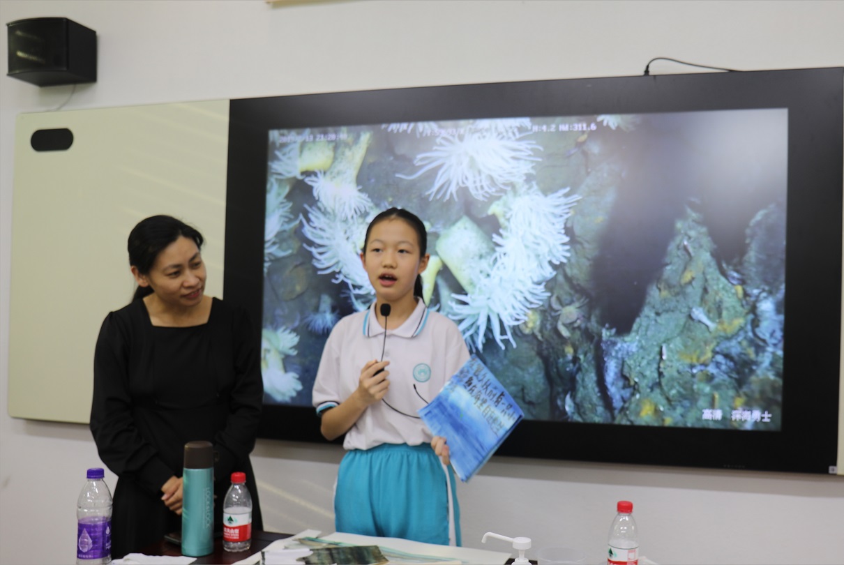 首先,來自深海所地外海洋系統研究室劉翠艷研究員為同學們開展生動的科普宣講,以幻燈片展示、現場交流互動以及視頻介紹等方式通俗易懂地傳授生命的豐富形式、講述海洋故事,科普深海知識,宣教“地外海洋”概念,提升海洋文化的親和力、感召力與影響力。同學們聽得津津有味,受益匪淺。在隨后的藝術創作環節,活動特邀藝術家Angelo Segarra先生作為現場美術指導,引導學生們繪制編寫一個科學性或科幻性的海洋故事?;顒又?,學生們認真作畫,在水彩描繪的背景上勾畫出海洋中的珊瑚、水草、魚、蝦、蟹、水母、鯨魚等海洋生物,呈現他們腦海中的海洋故事。活動最后,學生們現場分享自己的作品初一的陳雅昀同學生動形象地繪制了海洋中危險環境,提醒大家要敬畏海洋,不要到危險未知區域玩耍;李雅倩同學則描繪了一只誤吞塑料袋的小鯨魚痛苦地向人類呼救,呼吁大家保護海洋環境,重視海洋污染;簡玉萱同學則用擬人的手法編寫了一個小螃蟹和小鰻魚斗智斗勇的故事?;顒咏Y束后,同學們紛紛表示對深??茖W、海洋生態保護以及地外海洋的探索產生了濃厚的興趣。