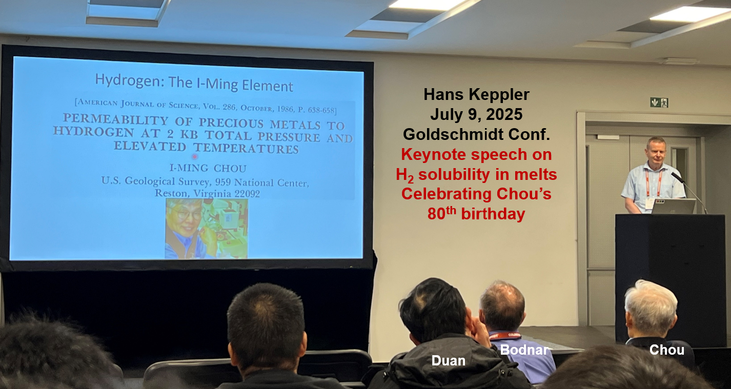 本屆大會參會人數規模達到4400人,還特別設立了專題分會(Session 02n)。該專題分會由六位國內外學者共同發起,共收到50余份摘要,旨在致敬我所周義明研究員在實驗地球化學領域做出的卓越貢獻。德國拜伊羅特大學高壓實驗中心(Bayerisches Geoinstitut)原所長Hans Keppler教授在主旨報告中將氫稱之為“I-Ming Element”,高度評價了周義明研究員在高溫高壓實驗中氧逸度控制與測量技術上的引領貢獻。特邀報告人包括美國國家科學院院士、弗吉尼亞理工大學Robert Bodnar教授,德國地球科學研究中心(GFZ)Christian Schmidt教授,以及巴黎地球物理研究所(IPGP)Razvan Caracas研究員。這一專題不僅彰顯了周義明研究員在國際地球科學界的學術影響力,也為與會者提供了一個深入探討礦物學、礦床學、巖石學以及深海科學等領域最新進展與未來方向的重要平臺,進一步促進跨學科的合作與交流。