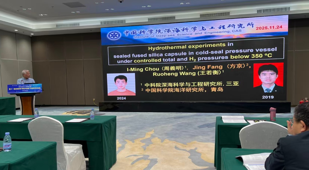 近日,深海極端環境模擬研究實驗室周義明研究員參加了第十一屆成礦理論與找礦方法學術研討會,并在“成礦作用的理論和實驗模擬”專題做了題為“Hydrothermal experiments in sealed fused silica capsule in cold-seal pressure vessel under controlled total and H2 pressures below 350 °C”的主題報告。周義明研究員重點介紹了實驗室在利用熔融毛細硅管開展低溫氧逸度控制方面的最新研究進展,展示了該技術在揭示錫的地球化學行為及成礦過程中的應用成果,并展望其未來的發展與應用,兩位前博士生(方京、王若衡)為共同作者。