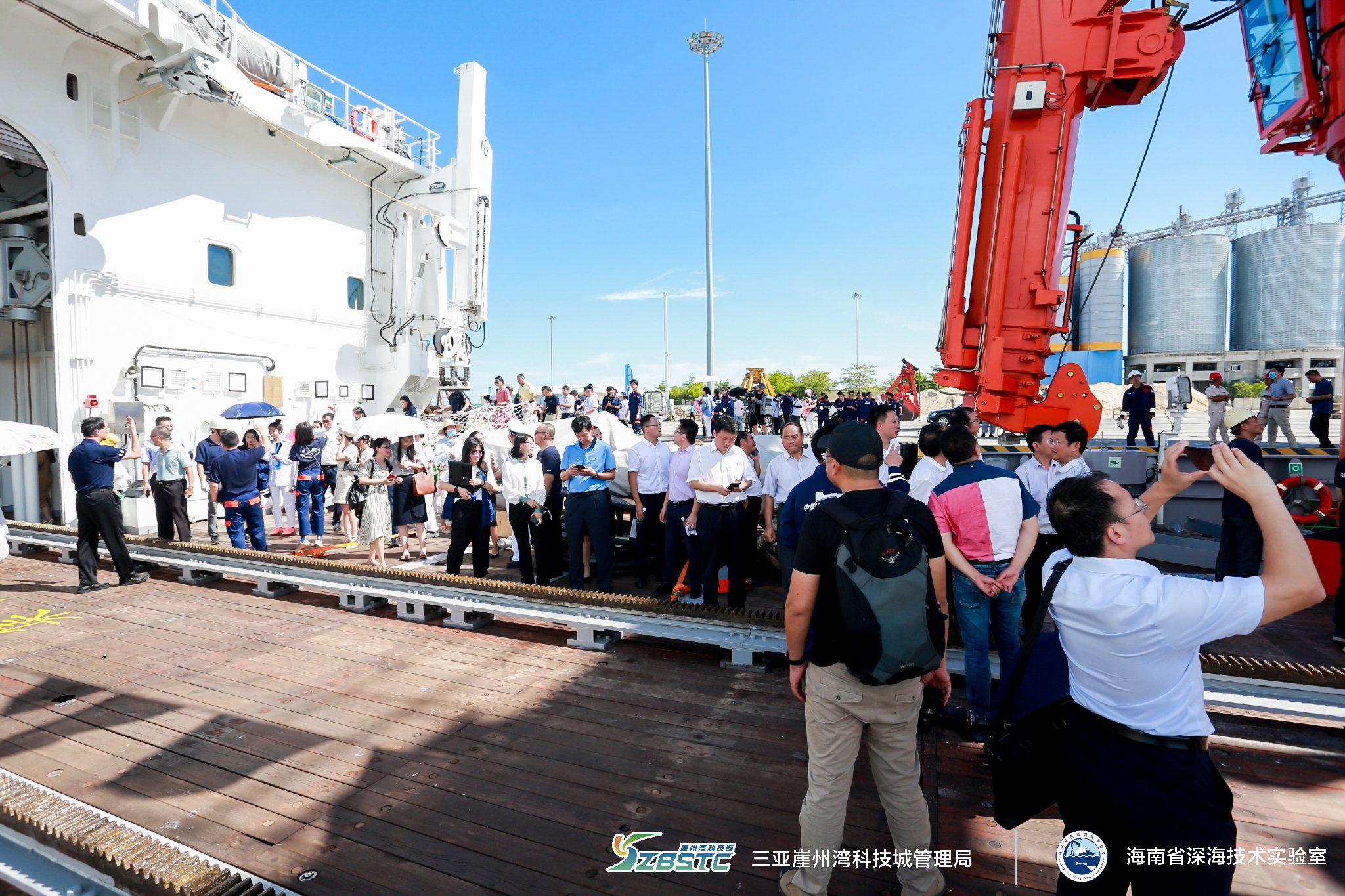 625, “探索二號(hào)”船從福建馬尾造船廠碼頭啟航,經(jīng)過(guò)830海里的航程, 28日下午,順利抵達(dá)三亞崖州灣科技城南山港碼頭。來(lái)自海南省人民政府、海南省科學(xué)技術(shù)廳、深圳市規(guī)劃和自然資源局、中國(guó)船舶集團(tuán)702研究所、704研究所、武漢理工大學(xué)、中科院沈陽(yáng)自動(dòng)化所、中科院聲學(xué)研究所、三亞崖州灣科技城管理局等相關(guān)單位代表共200余人參加接船儀式。