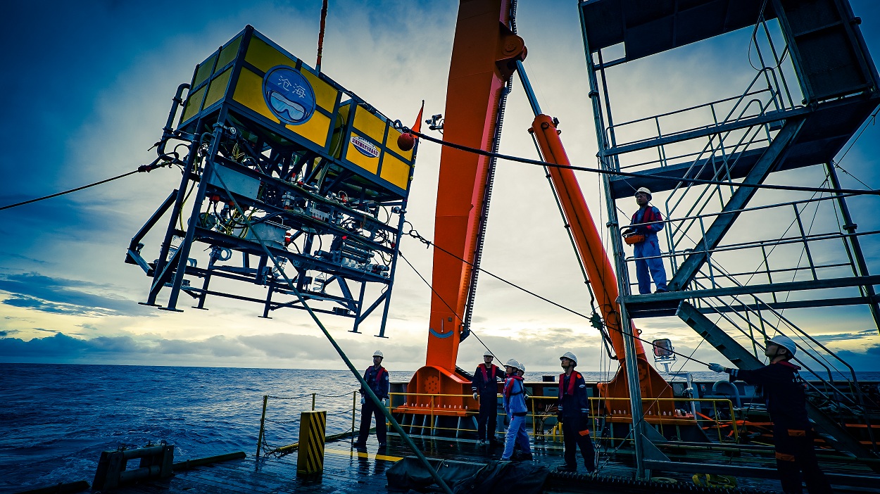 正在進(jìn)行回收作業(yè)的滄海號(hào)深海著陸器(張桅供圖)