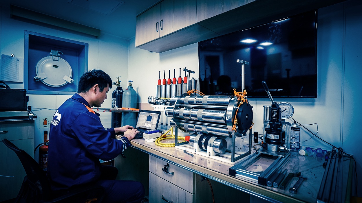 探索二號(hào)上,科研人員正在整理樣品和數(shù)據(jù)(張桅供圖)
