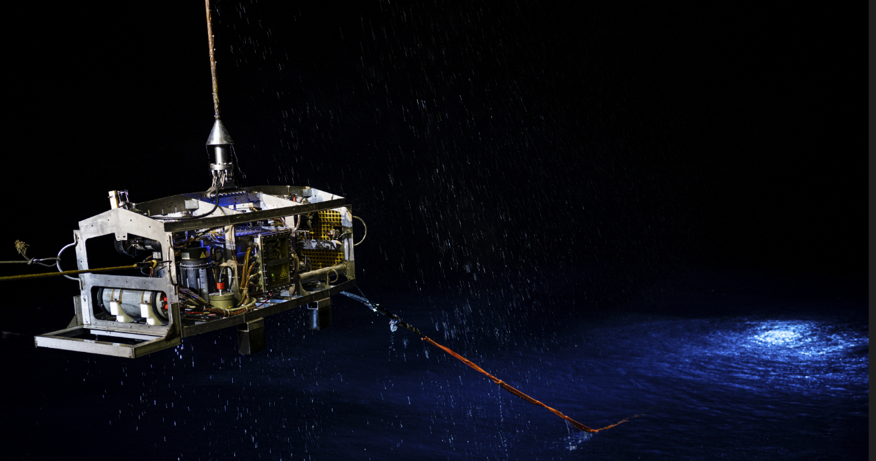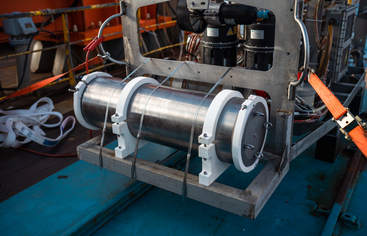 在本航次中,“探索二號”船通過光電復合鎧裝纜連接至中繼器,再通過非金屬輕質光電復合臍帶纜連接至ROV。中繼器與ROV組成柔性連接的分體式系統,該系統進行了4500米級海上試驗應用,有效驗證了“中繼器-ROV”的分體式布放-回收方案及測試流程,以及ROV各分系統及模塊的設計性能指標,并充分測試了ROV在4500m級大工作深度下的綜合作業能力,如定高、定深、定向、定速、樣品抓取收集等。
