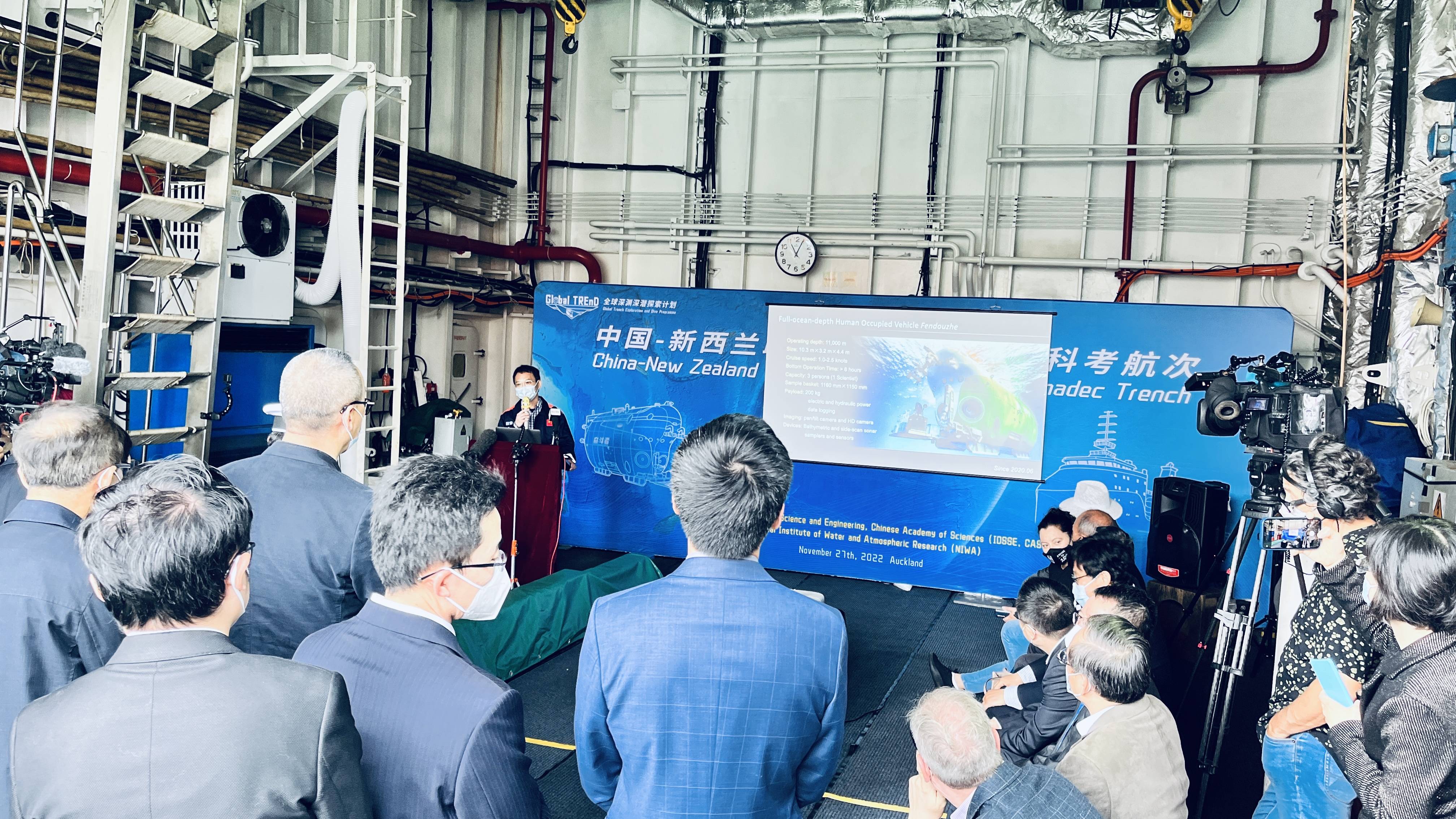 11月27日,中-新聯合深淵深潛科考隊在探索一號母船召開航次招待會。航次領隊兼首席科學家彭曉彤研究員介紹航次實施情況和成果。中國駐新西蘭大使王小龍、中科院副院長張亞平、NIWA副首席執行官Rob Murdoch、深海所副所長陽寧、NIWA研究員Ashley Rowden出席招待會致辭。出席本次活動的還有中國駐奧克蘭總領事陳世杰、奧克蘭博物館首席執行官David Gaimster以及新西蘭原住民代表、華人科學家、知名僑領和中外媒體等。