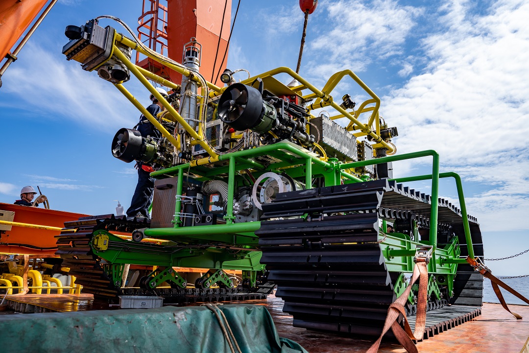 深海底爬行式移動作業系統作為深??茖W調查設備的搭載平臺,滿足高負荷、大質量、需要穩定支撐的科學儀器及考察裝備的海底科考需求,該系統具備履帶式行走機構,具備海底移動作業能力,同時采用輕量化設計,滿足海底沉積物稀軟底質的行駛條件,并且通過更換不同形式的履帶,實現海底多種復雜條件的行走功能。本次海試的最大深度到達4098米,履帶行走模塊,液壓模塊及控制系統運行正常,并搭載了矢量推進器、智能作業機械手及海底破碎收集模塊開展試驗,系統整體運行良好,順利完成海上驗收。